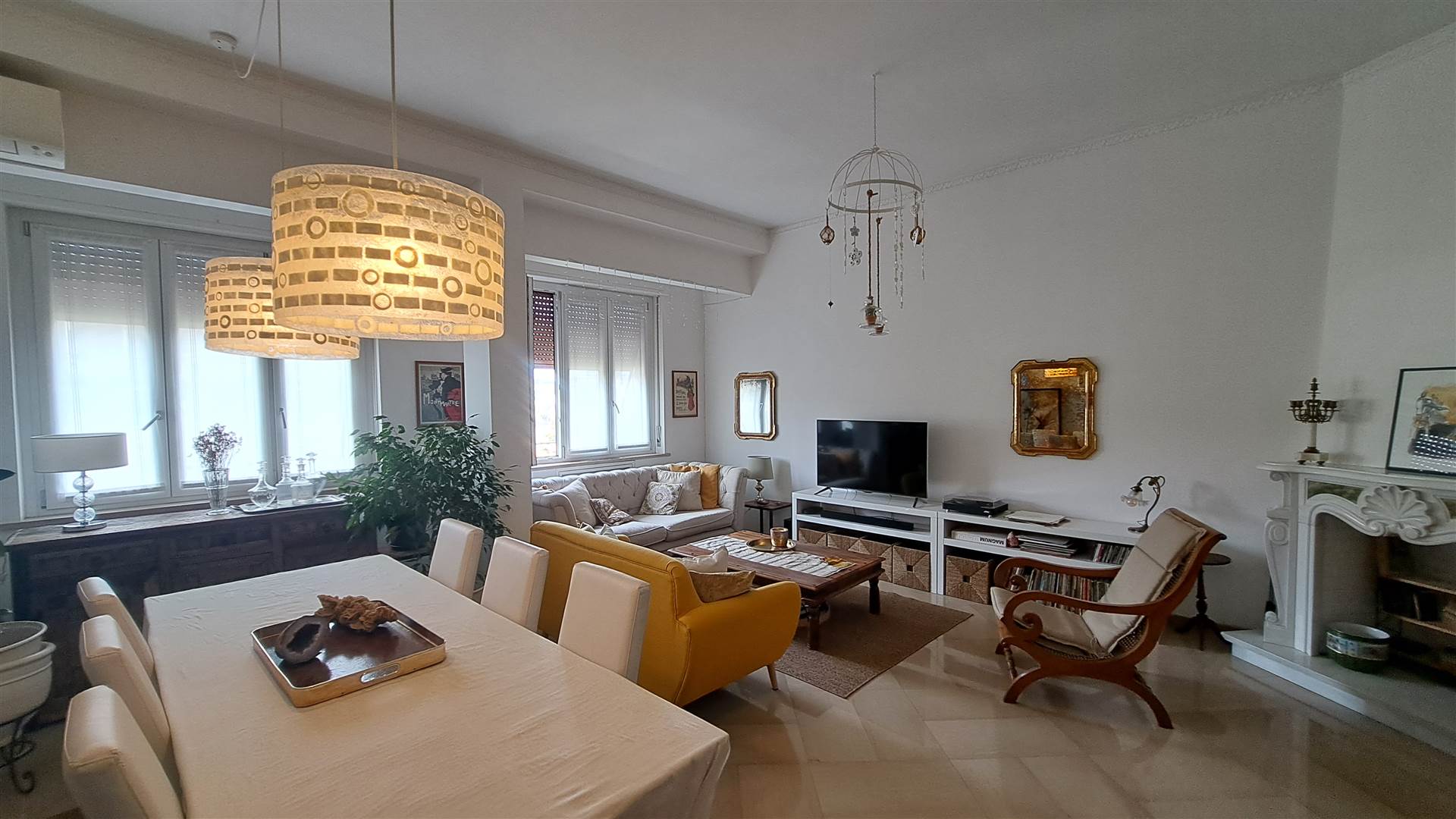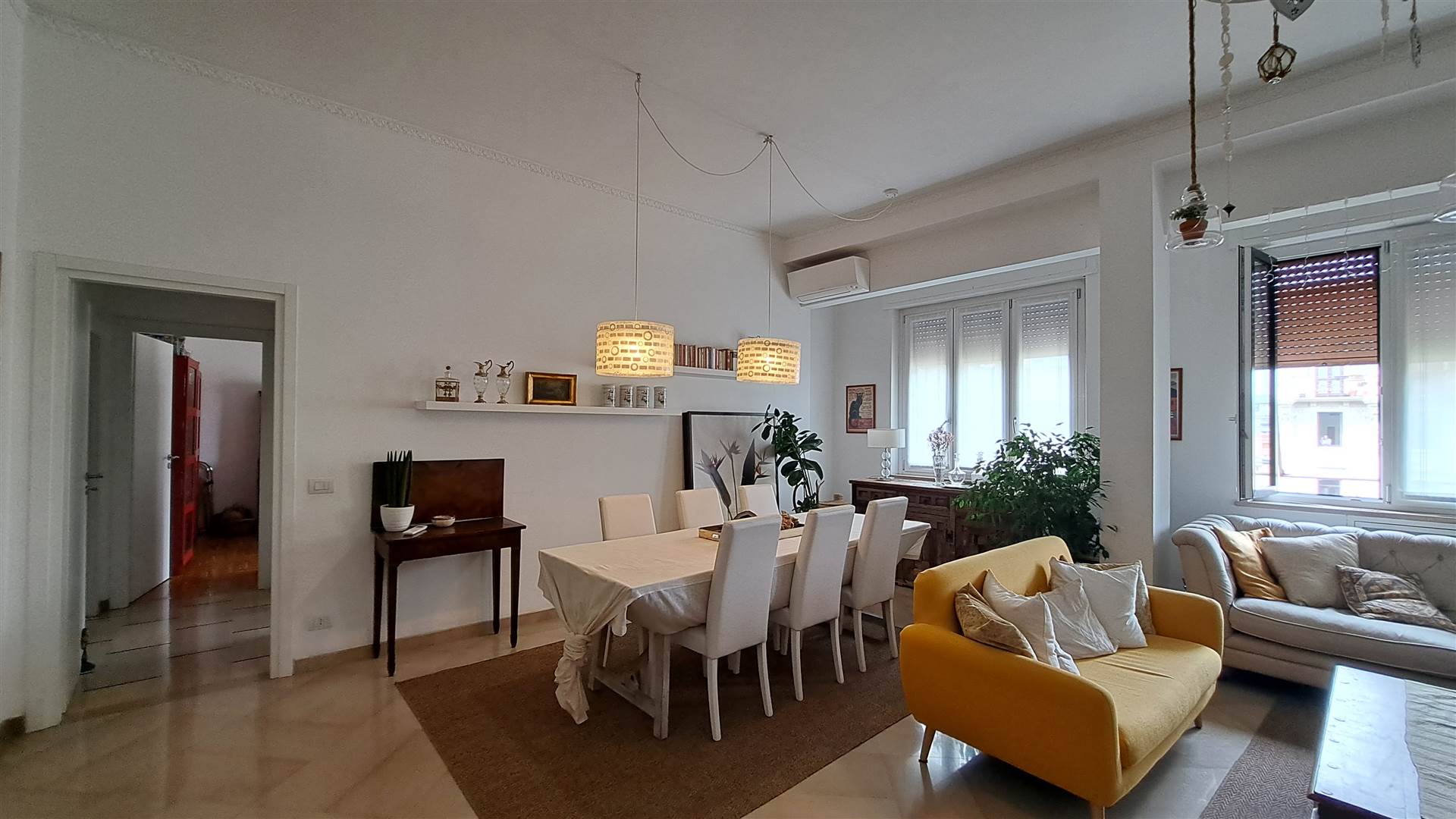 Un appartamento in contesto elegante anni '60, così composto: doppio ingresso, salone con camino, cucina semi-abitabile, quattro ampie camere da letto due bagni, un ripostiglio e due balconi. La proprietà è completata da due vani solaio al piano sottotetto.