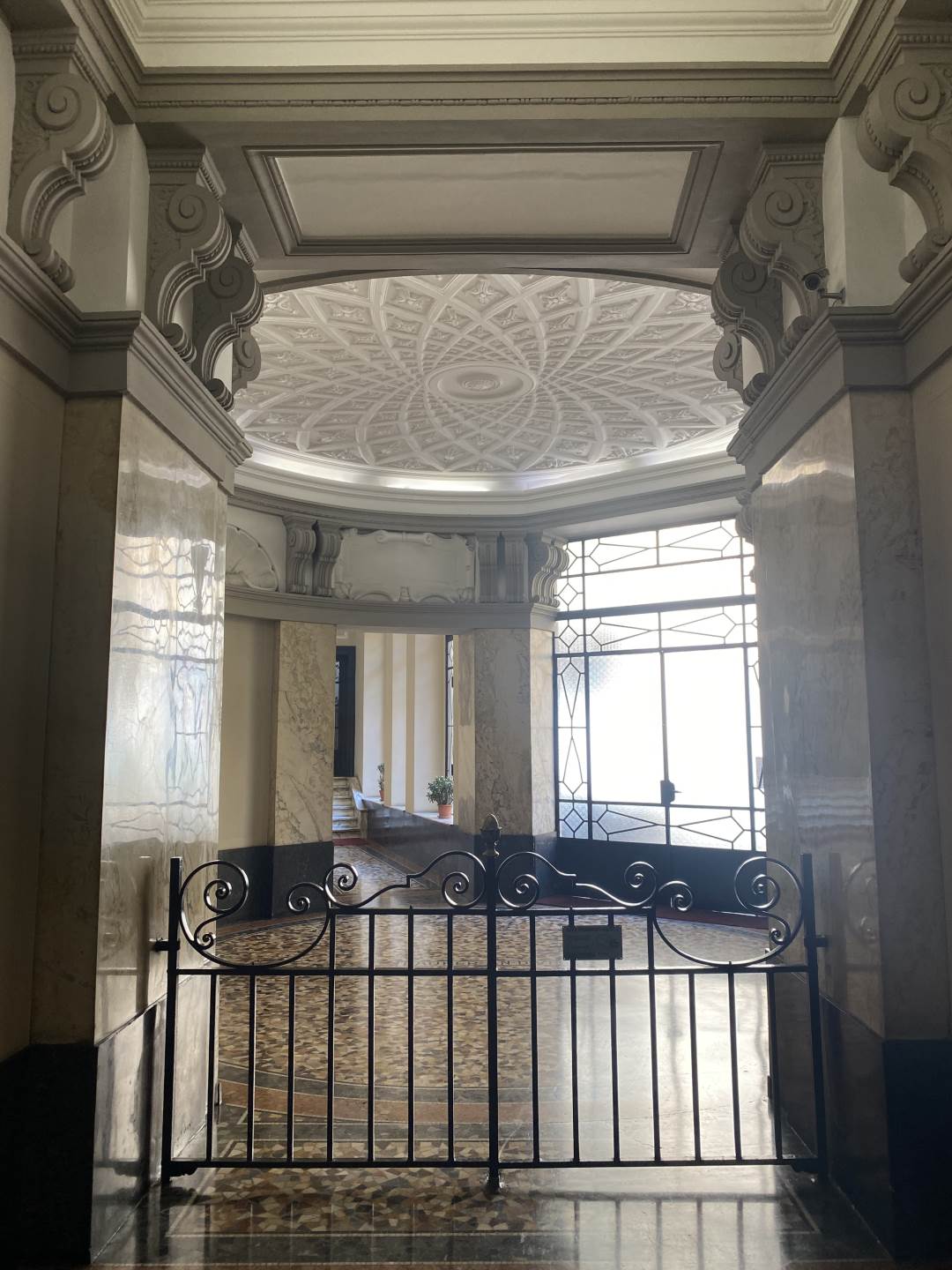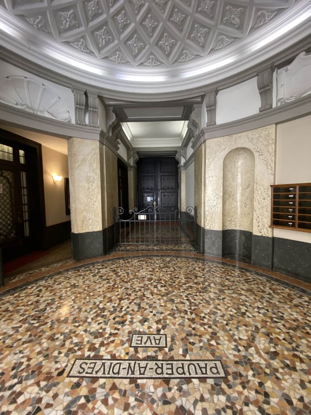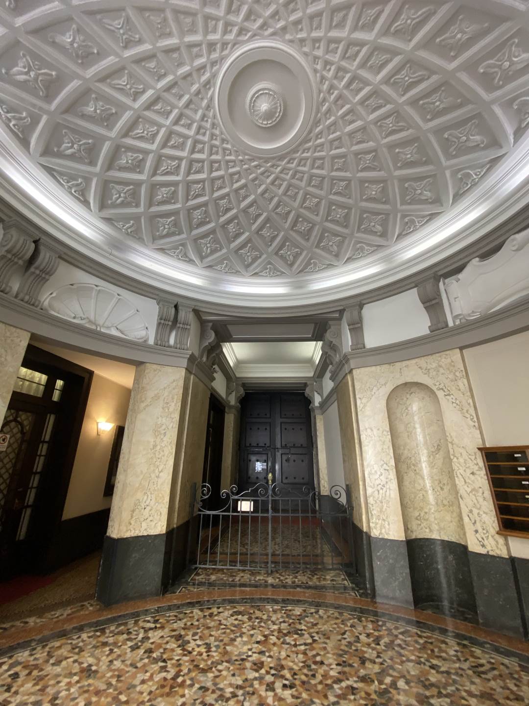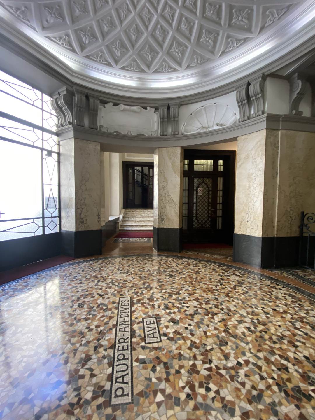 Il contesto è semplicemente mozzafiato, dal momento in cui si varca il classico portone di legno della prima metà del '900 si rimane subito stupiti da un affascinante atrio con pavimento a mosaico e soffitto circolare con rilievi degni di nota, dove si trova anche la portineria presente la mattina.